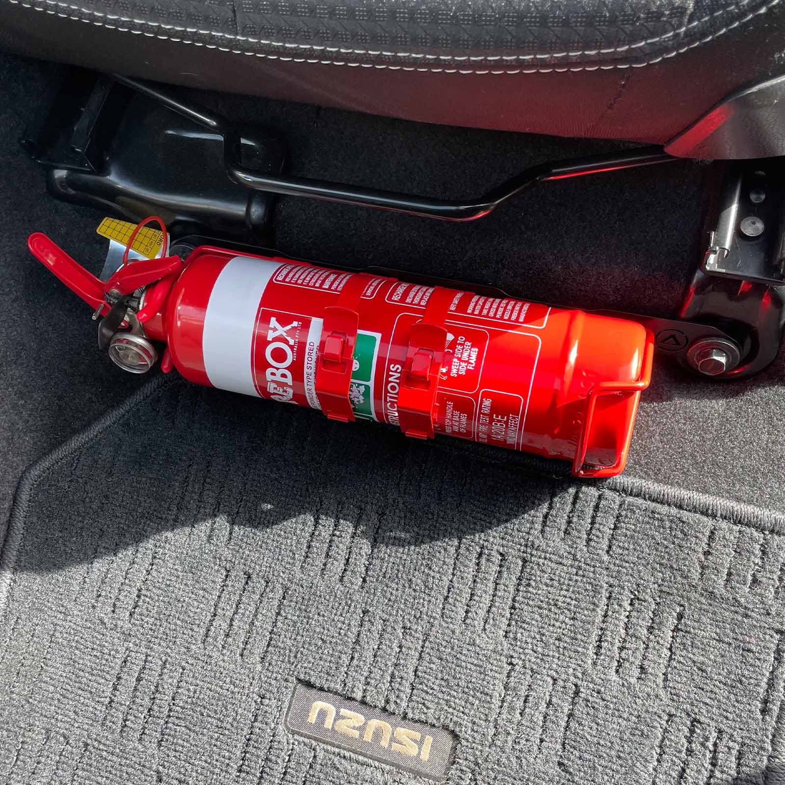 Keep your fire extinguisher close at hand, mounted safely and securely using our Fire Extinguisher Bracket attached directly to your Isuzu MU-X's seat mounts.