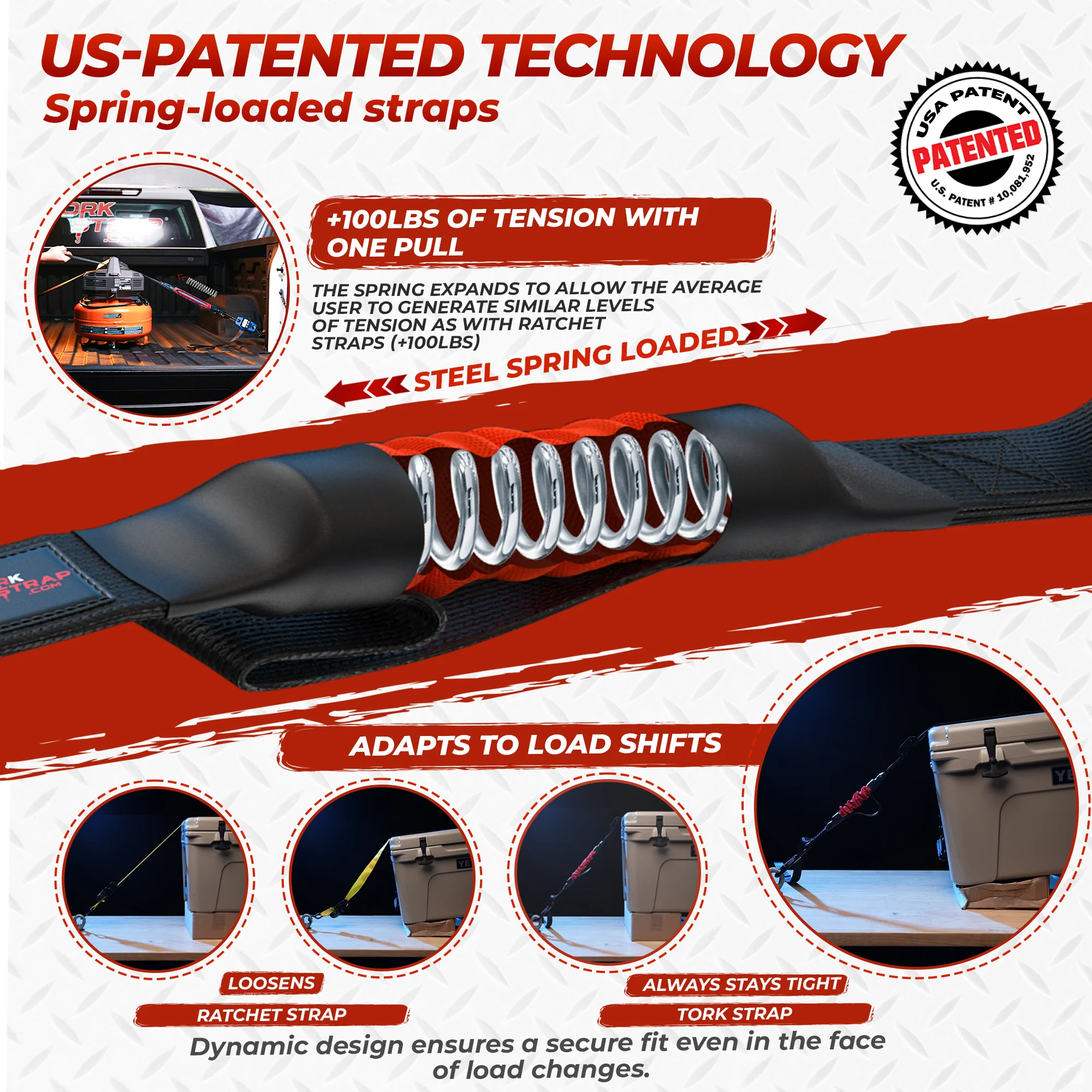 - Dynamic Tension: Unlike ratchet straps which provide static tension, TorkStrap's dynamic tension adapts to shifts in the load, maintaining secure grip and reducing the risk of loosening.